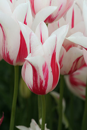 Ivory white delicately flamed with strawberry red on both the inside and outside of the pointed petals. Introduced in 1976.