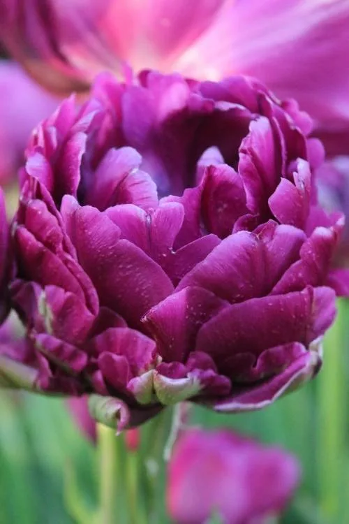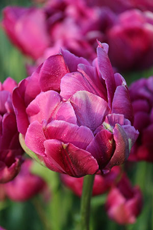 Layered deep purple flower. Pairs well with lighter shades of tulips. Large blossoms. Introduced in 2004.