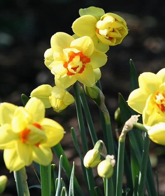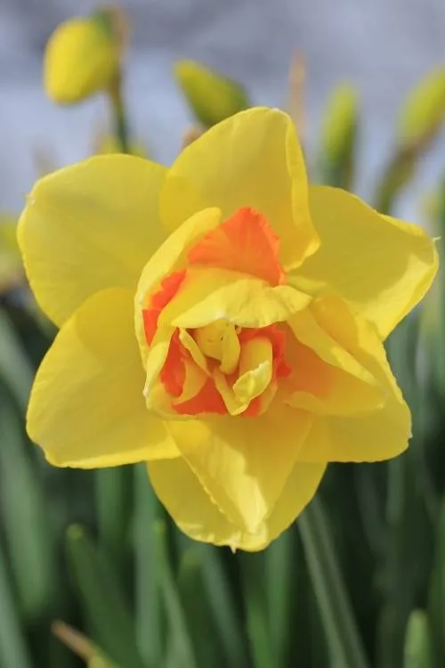 Deep yellow with a red orange ruffled double cup. Long lasting and a favorite of ours! Introduced in 1956.