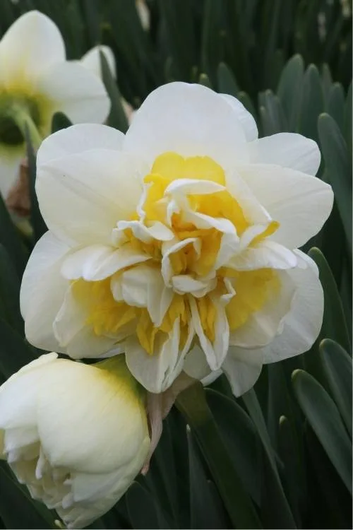 White petals with double sunny yellow cup. Introduced in 1962.
